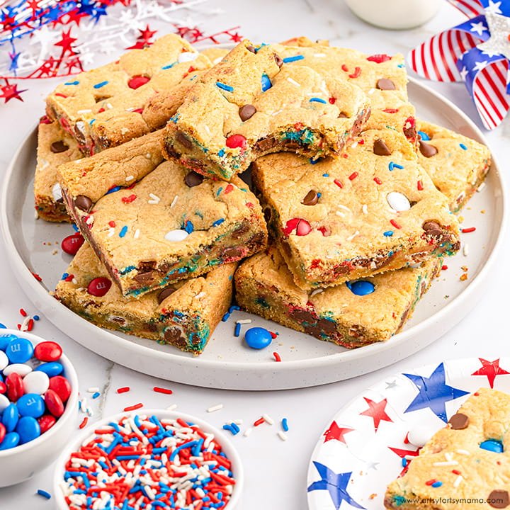 These patriotic Red, White, and Blue M&M’s Cookie Bars are the perfect dessert for celebrating the 4th of July and Memorial Day!