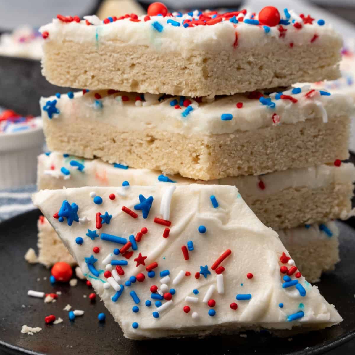 These frosted sugar cookie barscome loaded with sweet vanilla frosting and sprinkles in red, white, and blue, perfect for any Independence Day dessert table.