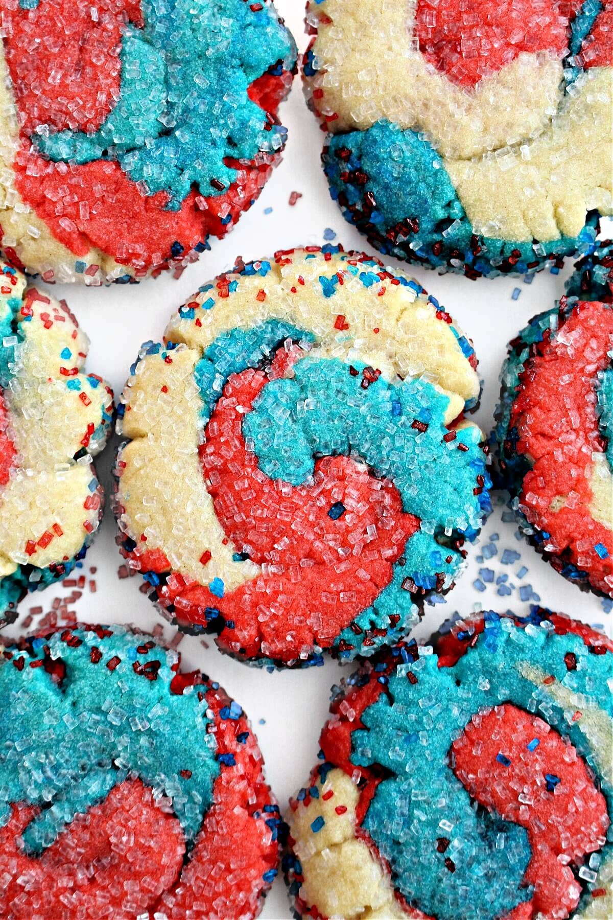 Thanks to those who defend and protect our country, we have the freedoms we enjoy in our country. Celebrate the patriotic holidays with crunchy, festive 4th of July Cookies, sparkling with sugar and swirled with red, white, and blue.