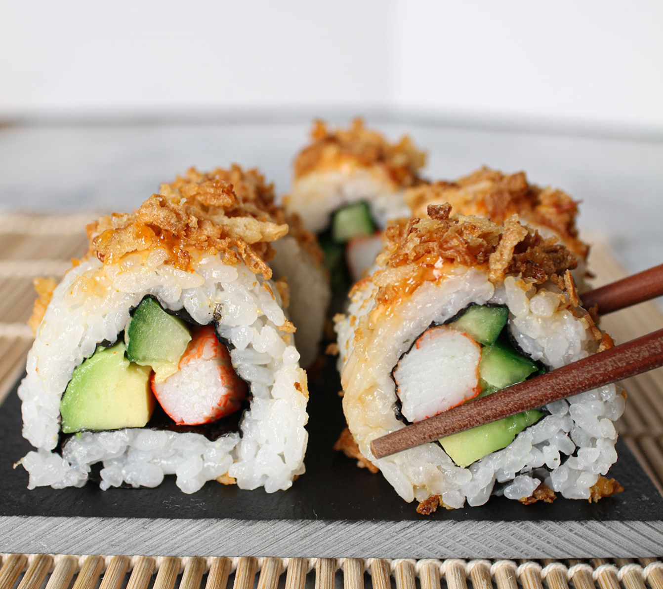 Treat your taste buds to a delicious crunchy roll filled with cool cucumber, creamy avocado succulent sashimi (or imitation crab meat) topped with crispy onions to bring a satisfying crunch.