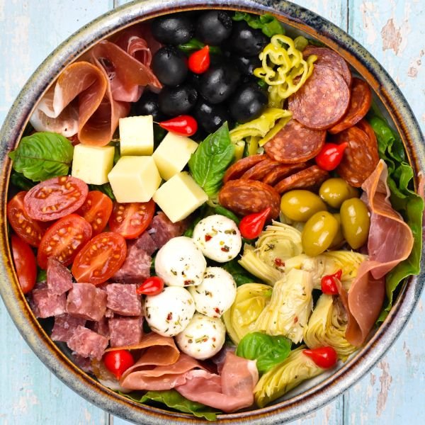 Inspired by Italian antipasto platters, this salad is loaded with cured meats, cheese, olives, and fresh vegetables. It’s hearty enough to serve as a main course or shareable appetizer. A flavorful option for any Mediterranean-style meal.