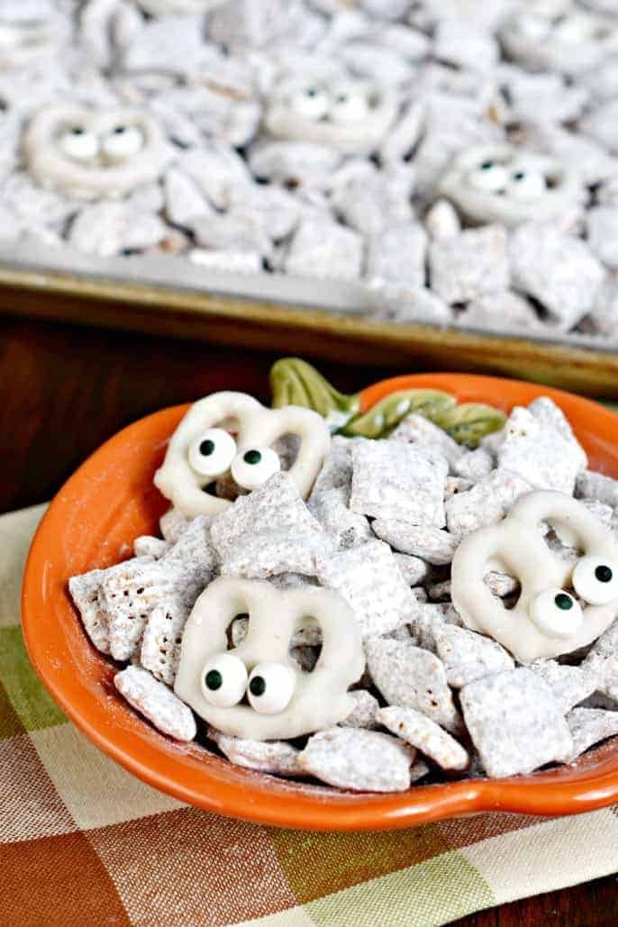 A spooky spin on the classic puppy chow! These Halloween Muddy Buddies feature white chocolate-coated cereal, candy eyes, and pretzel mummies for a fun, crunchy treat. Sweet, messy, and addictive — the perfect party mix for the spooky season.