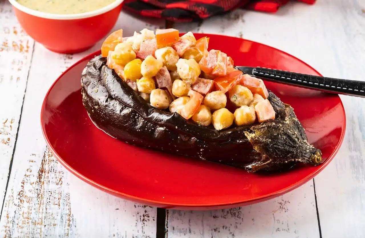 The soft roasted eggplant contrasts beautifully with the chickpea mixture. A vibrant, wholesome choice for a Mediterranean-style holiday menu.