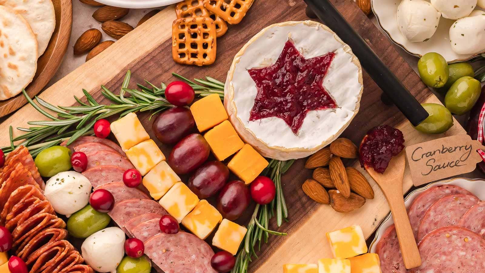 It’s filled with colorful meats, cheeses, olives, and seasonal garnishes arranged in a wreath shape.