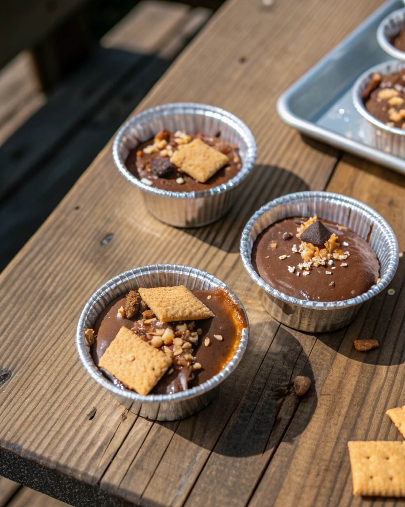 These little cups are rich, creamy, and slightly crunchy thanks to crushed crackers. Think Reese’s-style flavor with a rustic campfire twist.
