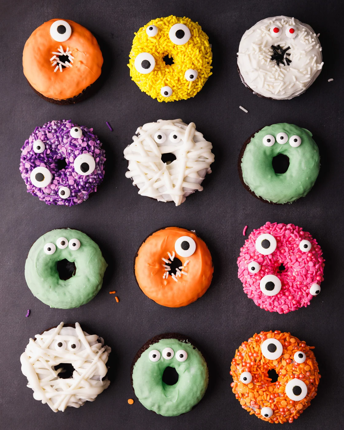 Baked, not fried, these chocolate donuts get a monster makeover with bright icing and candy eyes. They’re playful, delicious, and just the right balance of sweet and spooky — great for breakfast or dessert!