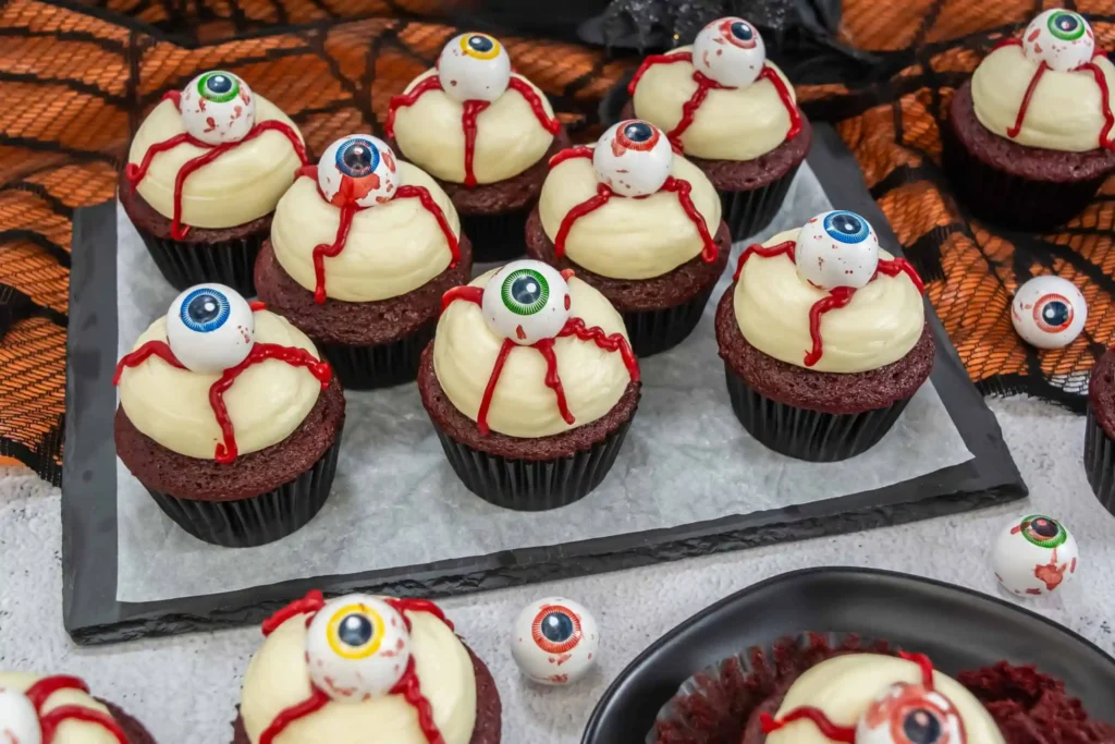 Classic red velvet cupcakes get a frightful twist with cream cheese frosting and candy “eyeballs.” These spooky cupcakes are deliciously rich and the perfect showstopper for your Halloween dessert table.