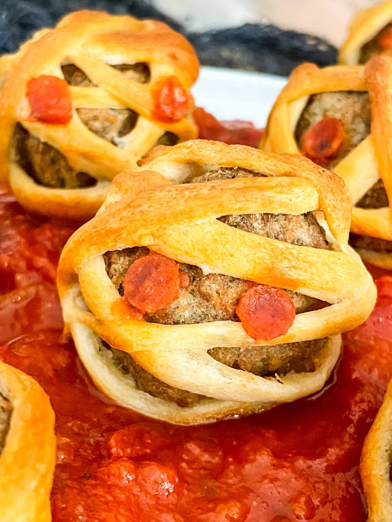 A savory spin on the spooky season! These mummy meatballs are wrapped in crescent dough “bandages” and topped with candy eyes. Perfect as a Halloween appetizer or fun family dinner idea.