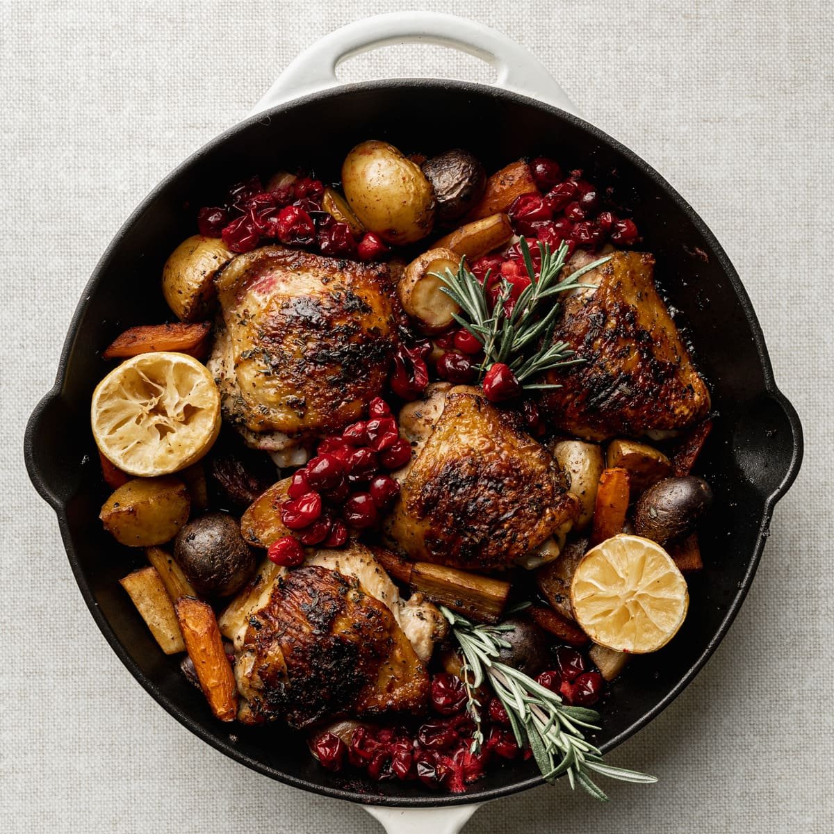 This roasted cranberry chicken features juicy chicken thighs with crispy skin, complemented by tart cranberries and fragrant herbs. It’s a simple yet elegant dinner option that impresses without stress.