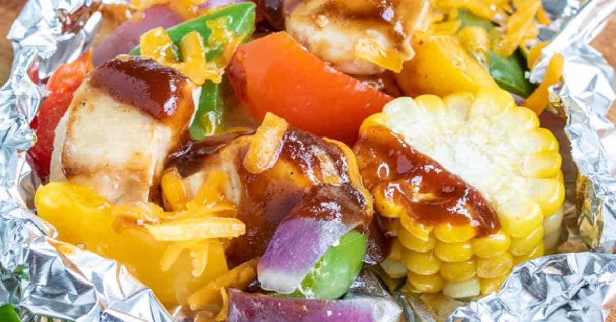 BBQ chicken foil packs with chicken, veggies, cheese, corn, red onion, and your favorite BBQ sauce.