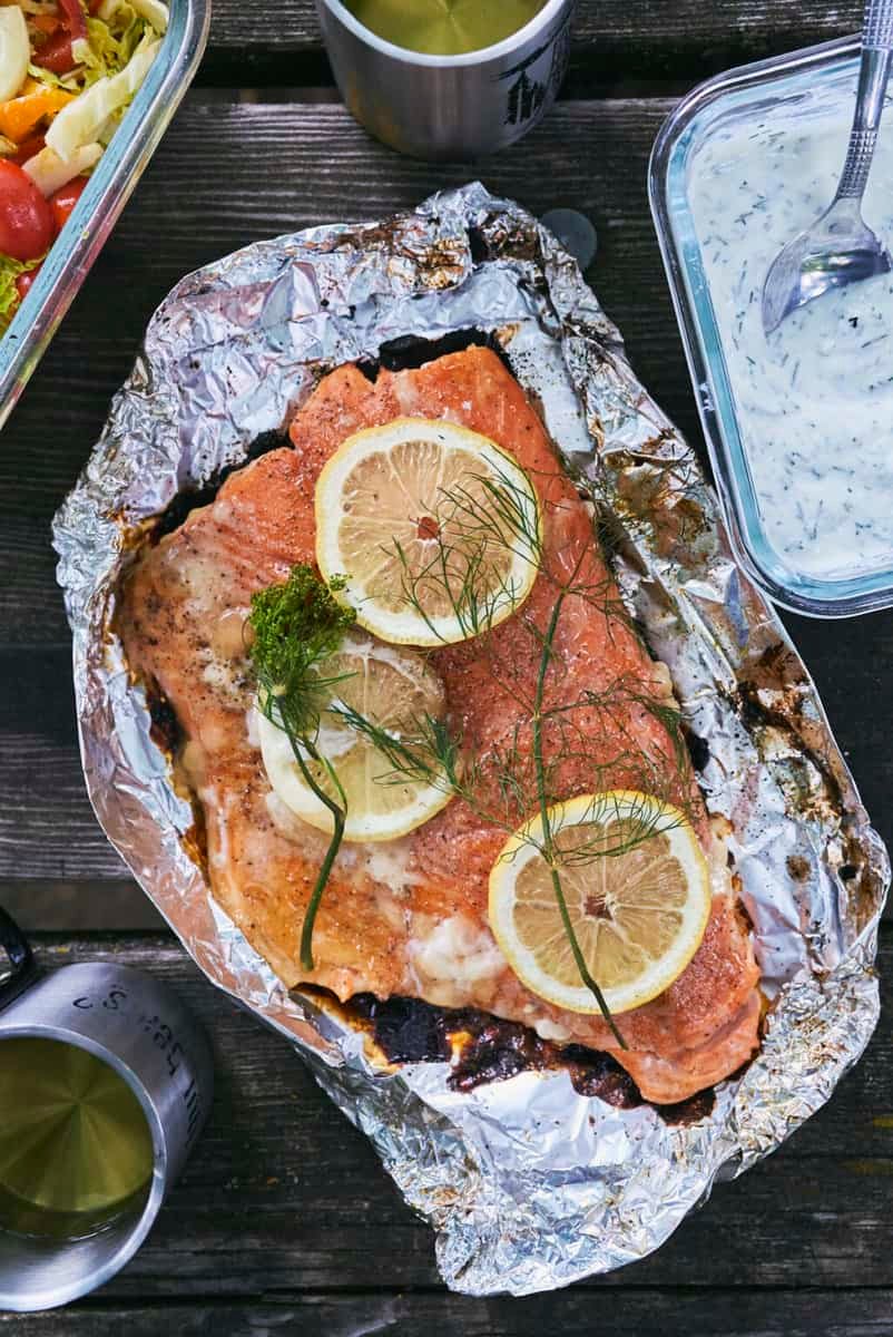 Cook salmon over the campfire with this super easy recipe. The classic lemon-dill yogurt sauce is one of the best sauces for salmon making you scooping for more.