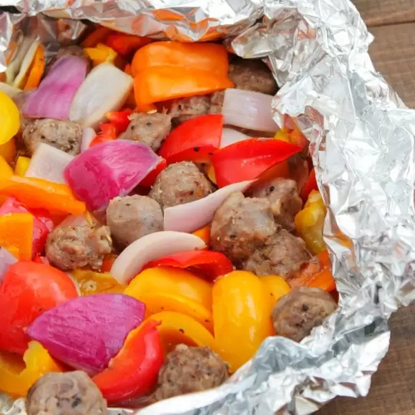 The ingredients include sausage, bell peppers, and onions cooked together to make a perfect family dinner or camping meal sprinkled with salt and pepper.