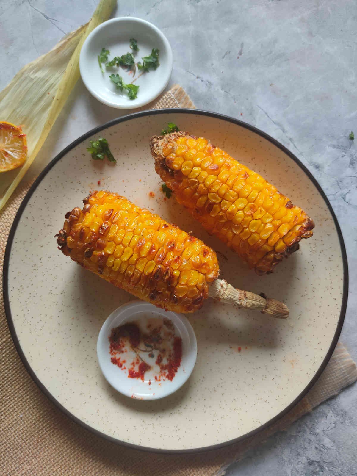 Air fryer Corn on the Cob is a must-try Indian-style vegan, healthy recipe. It is a perfect nutritious snack or an appetizer that’s crispy, browned outside, and tender and juicy inside.