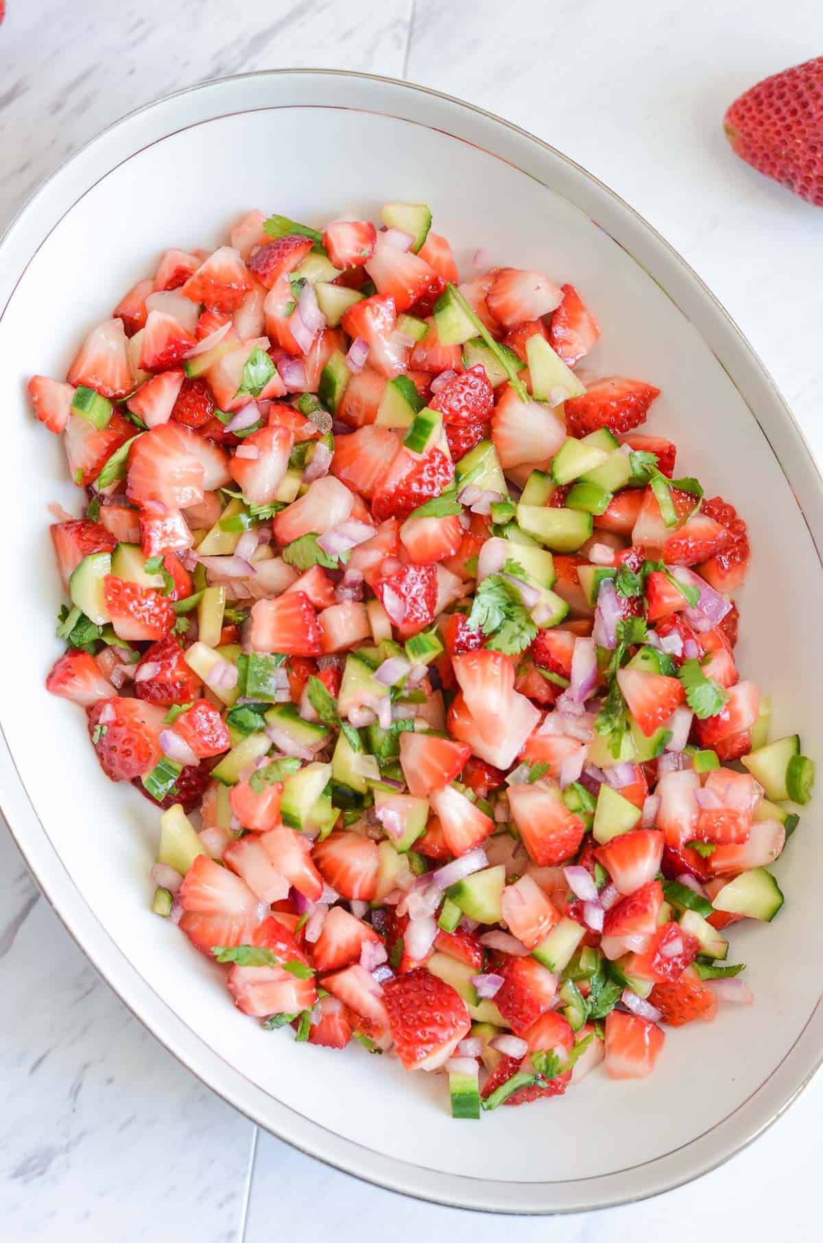 Cucumber strawberry salsa dip is a vegan, gluten-free, low-calorie dish, with just six ingredients. It is a hydrating and delicious side dish best served with tacos, a burrito bowl, or simple chips.