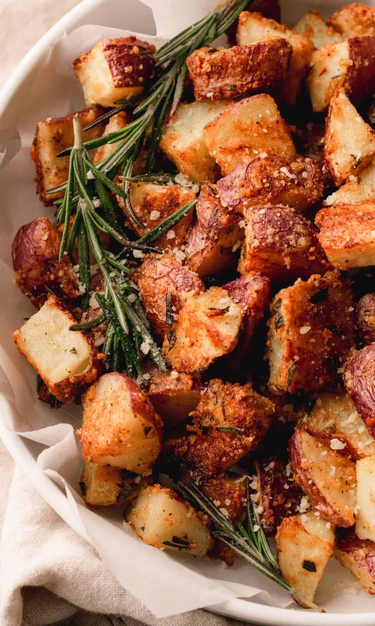 These Parmesan Roasted Red Potatoes with Rosemary are perfectly golden brown and crispy. They are roasted with parmesan and fresh rosemary which is a perfect flavor combination. This easy side dish is perfect for your holiday meal!