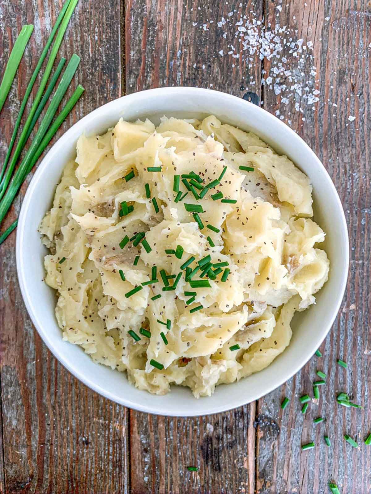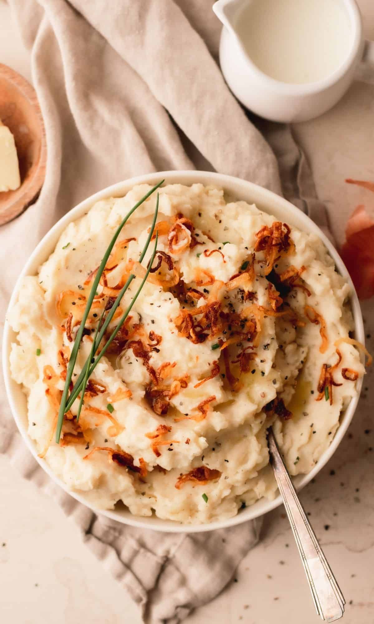 The potatoes are mashed with creamy Boursin cheese and topped with crispy shallots and chives. They are a perfect addition to any dinner and will quickly become your favorite side dish.