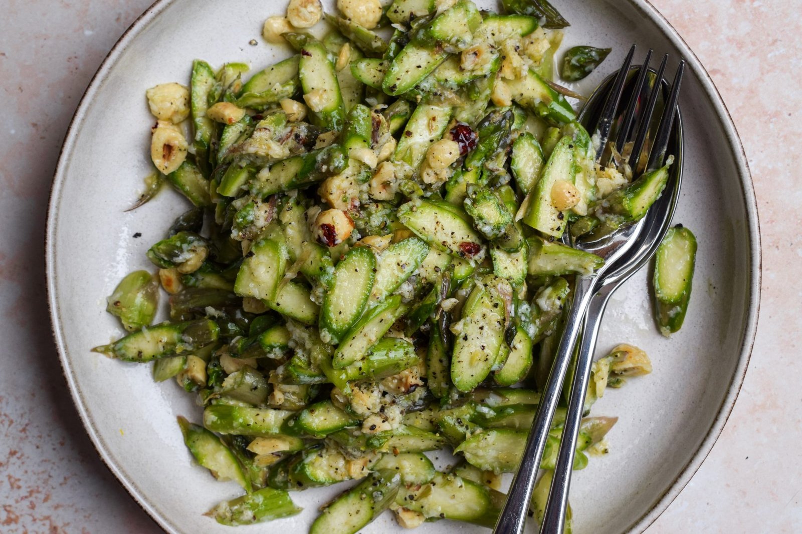 This easy Raw Asparagus Salad with Lemon, Hazelnuts & Pecorino balances crisp and fresh, sharp and salty and creamy and crunchy in this simple spring salad that celebrates a seriously underrated way to serve asparagus – raw!