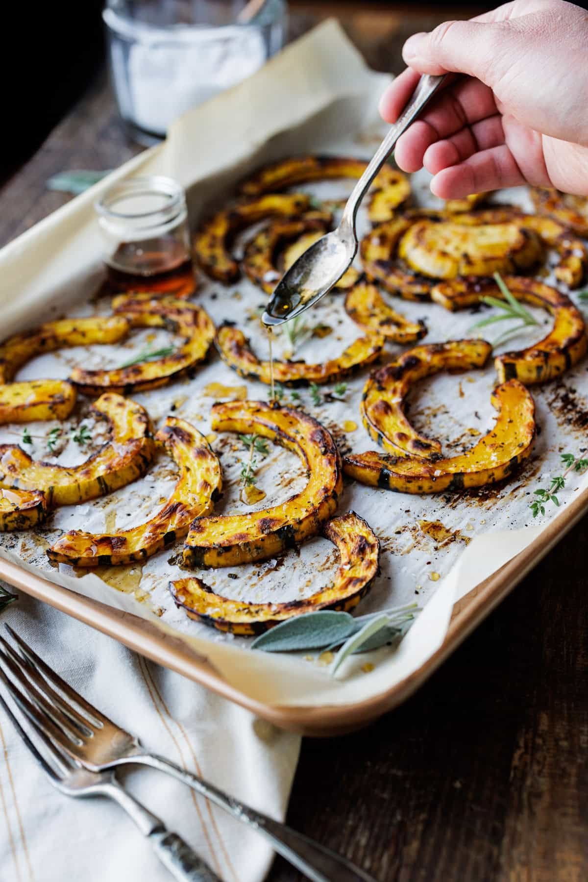 Roasted delicata squash is the perfect fall side dish. With a drizzle of maple syrup and a sprinkling of fresh herbs, it’s bursting with sweet and savory flavors. While roasting, the sweet delicata squash turns into tender, golden slices with beautifully caramelized edges.