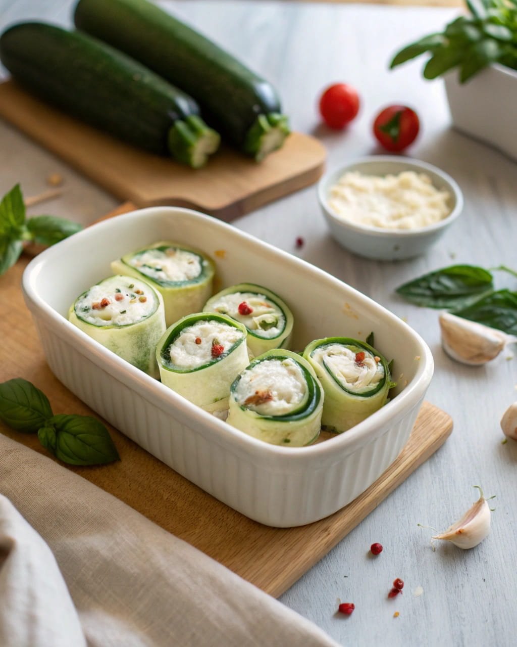 Baked zucchini ricotta rolls are tender, cheesy, and perfect for spring entertaining. Thin zucchini slices wrap around a creamy filling that feels indulgent but light. These rolls are great served warm or at room temperature.