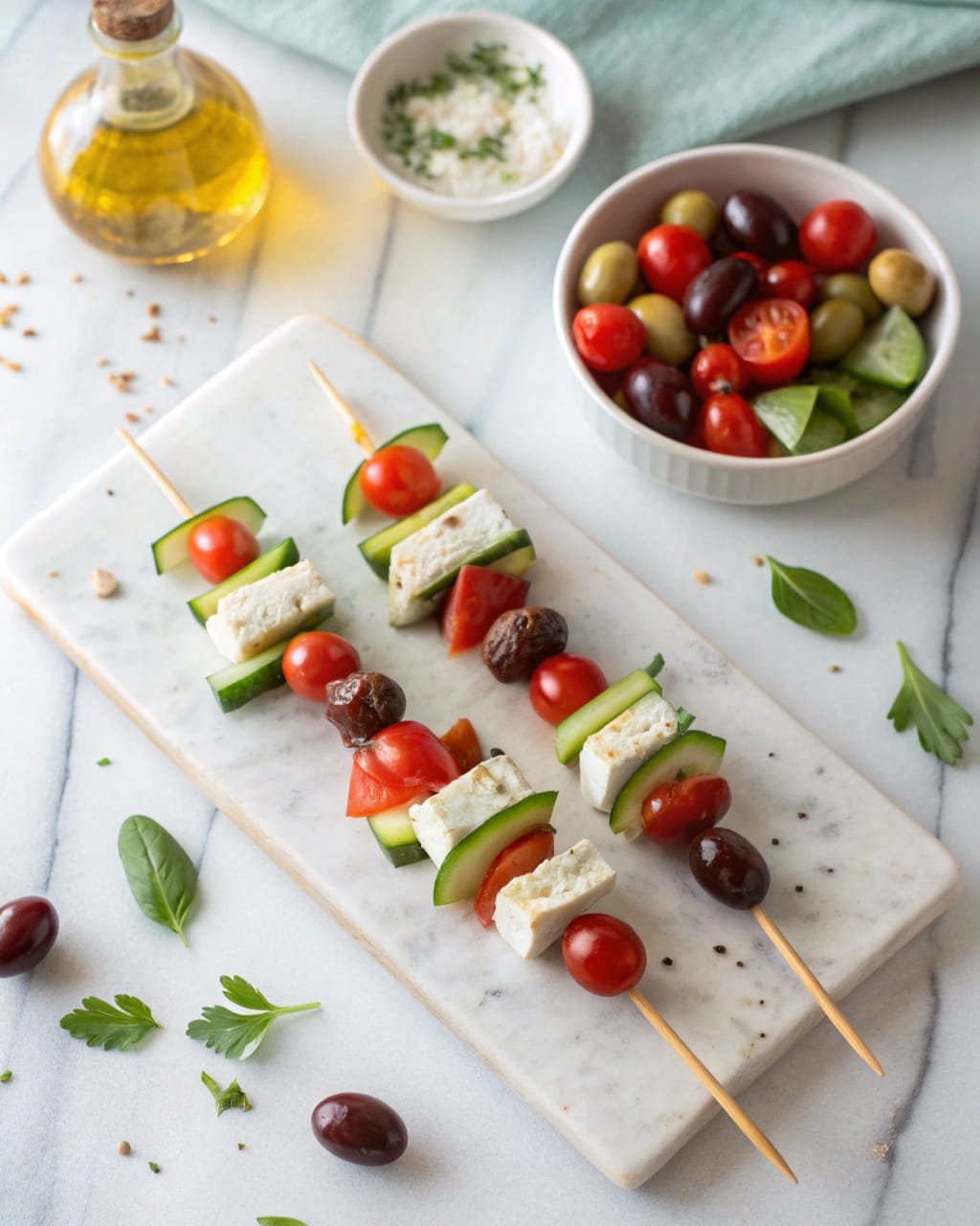2. Thread tomatoes, cucumber, olives, and feta onto small skewers or toothpicks.