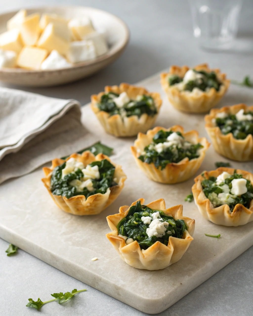 These mini spinach and feta phyllo cups are flaky on the outside with a warm, savory filling inside. The combination of salty feta and tender spinach makes them a spring party classic. They’re elegant enough for showers but simple enough for casual gatherings.