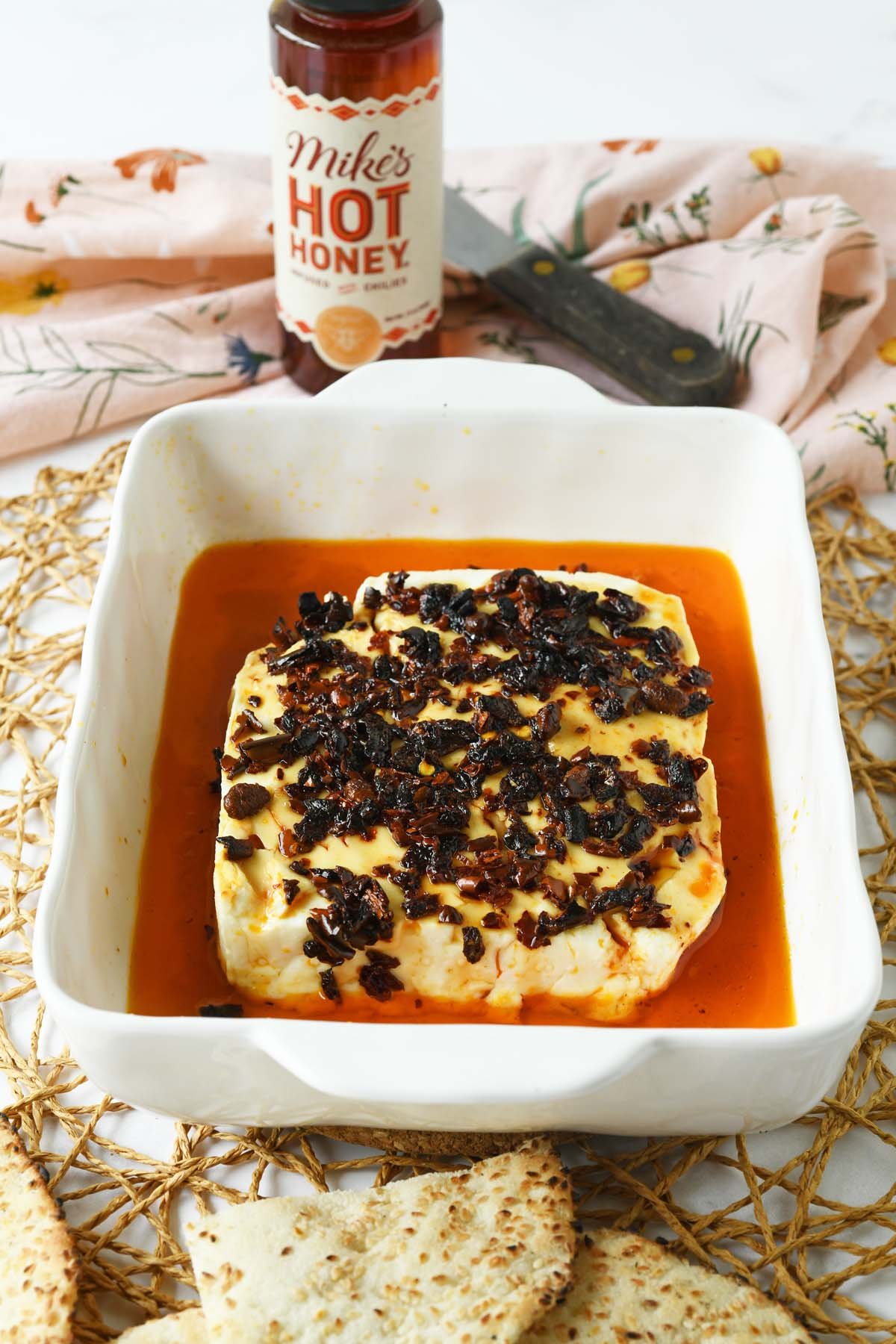 Creamy and salty feta cheese is swizzled with olive oil, sprinkled with chili crunch and baked to a perfection. Finished with Mike’s Hot Honey it is then broiled and caramelized. Serve this quick appetizer with pita bread, chips, crackers, or enjoy alone!