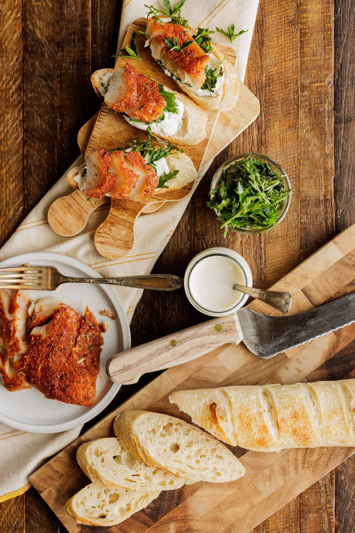 Toasted sourdough baguette topped with creamy whipped ricotta, tangy herb salad, and smoked flaky fish. This smoked fish recipe is perfect for entertaining, offering a balance of smoky, savory flavors.