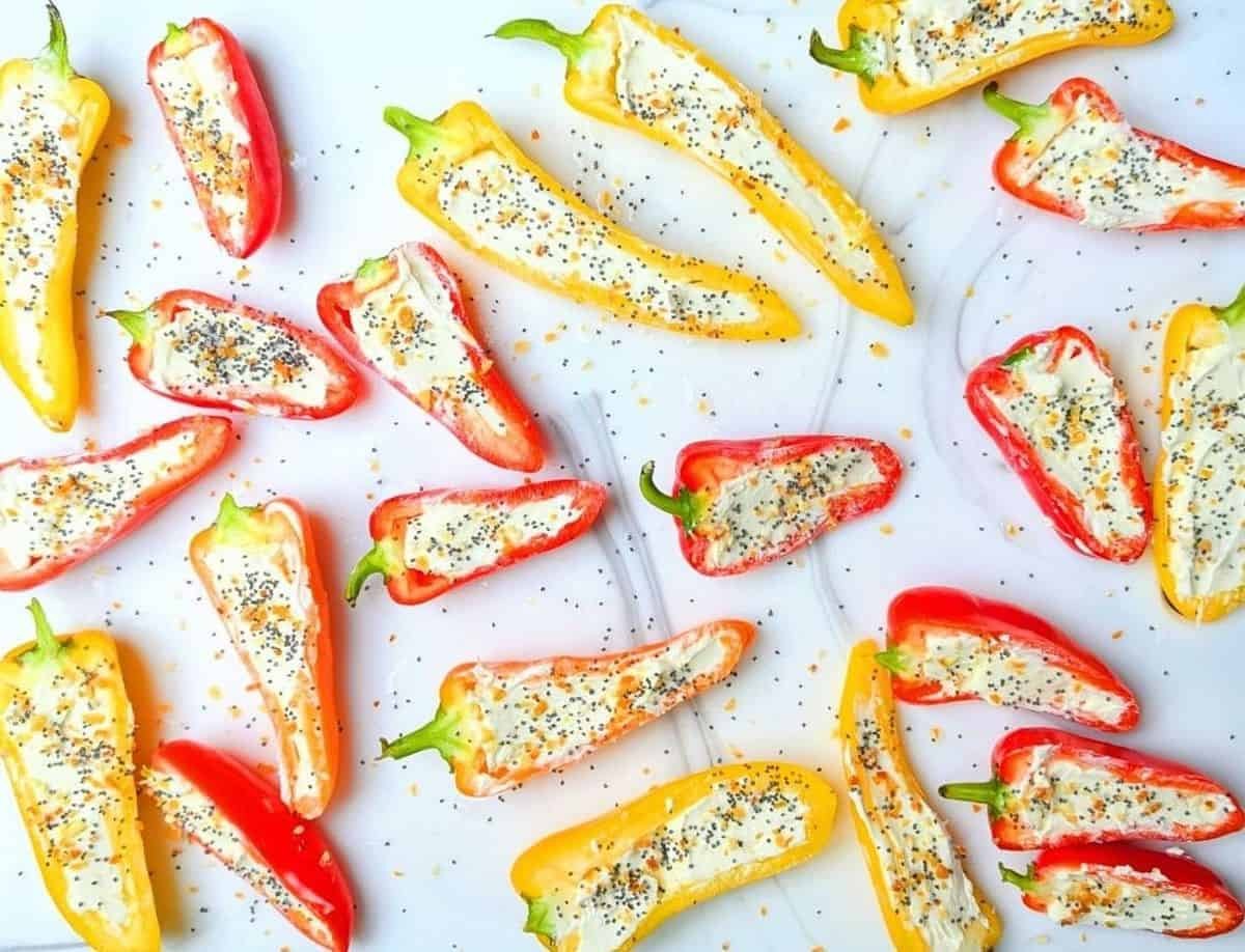 This no-bake snack uses colorful sweet peppers–a perfect choice when you’re not craving super spicy. Filled with cream cheese and topped with everything seasoning, these creamy, crunchy little peppers always fly off the party tray!