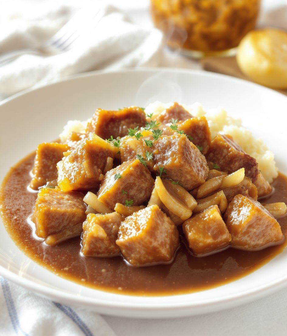 The meat becomes melt-in-your-mouth soft after hours of gentle cooking, while the gravy thickens into a silky, deeply flavored sauce that begs to be spooned over mashed potatoes or rice. It’s humble food with big flavor—hearty, nostalgic, and deeply satisfying.