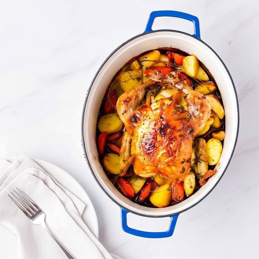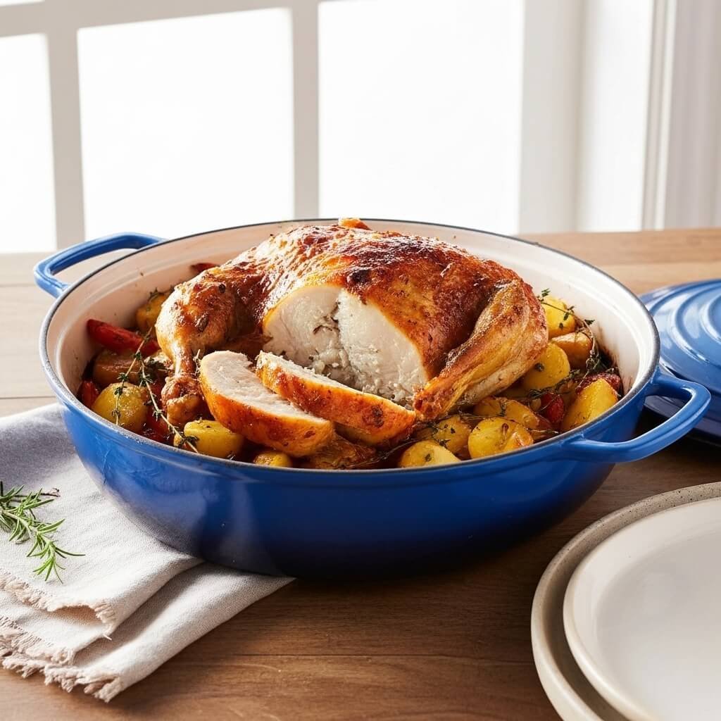The Dutch oven locks in moisture while giving the skin that beautiful golden crisp, and the flavors soak all the way through the meat. I usually throw in a few vegetables underneath and let everything roast together, which makes dinner even easier.