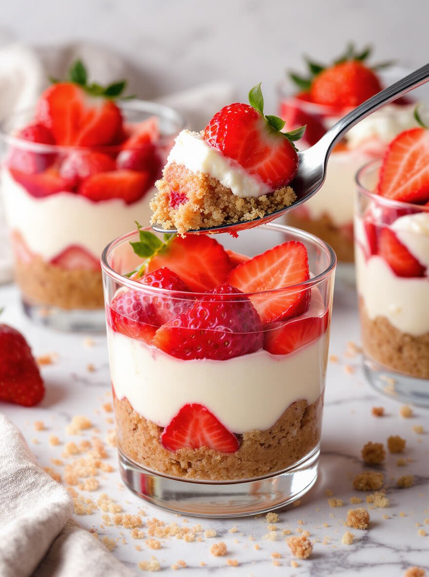 These no-bake strawberry cheesecake cups are creamy, refreshing, and incredibly easy to make. With layers of buttery biscuit crumbs, smooth cheesecake filling, and fresh strawberries, they’re the perfect quick dessert for any occasion.