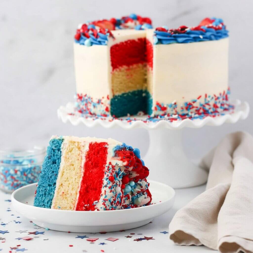 A soft and fluffy vanilla layer cake colored in vibrant red, white, and blue layers, finished with a smooth, creamy frosting. Perfect for celebrations and gatherings, this cake is as beautiful as it is delicious.