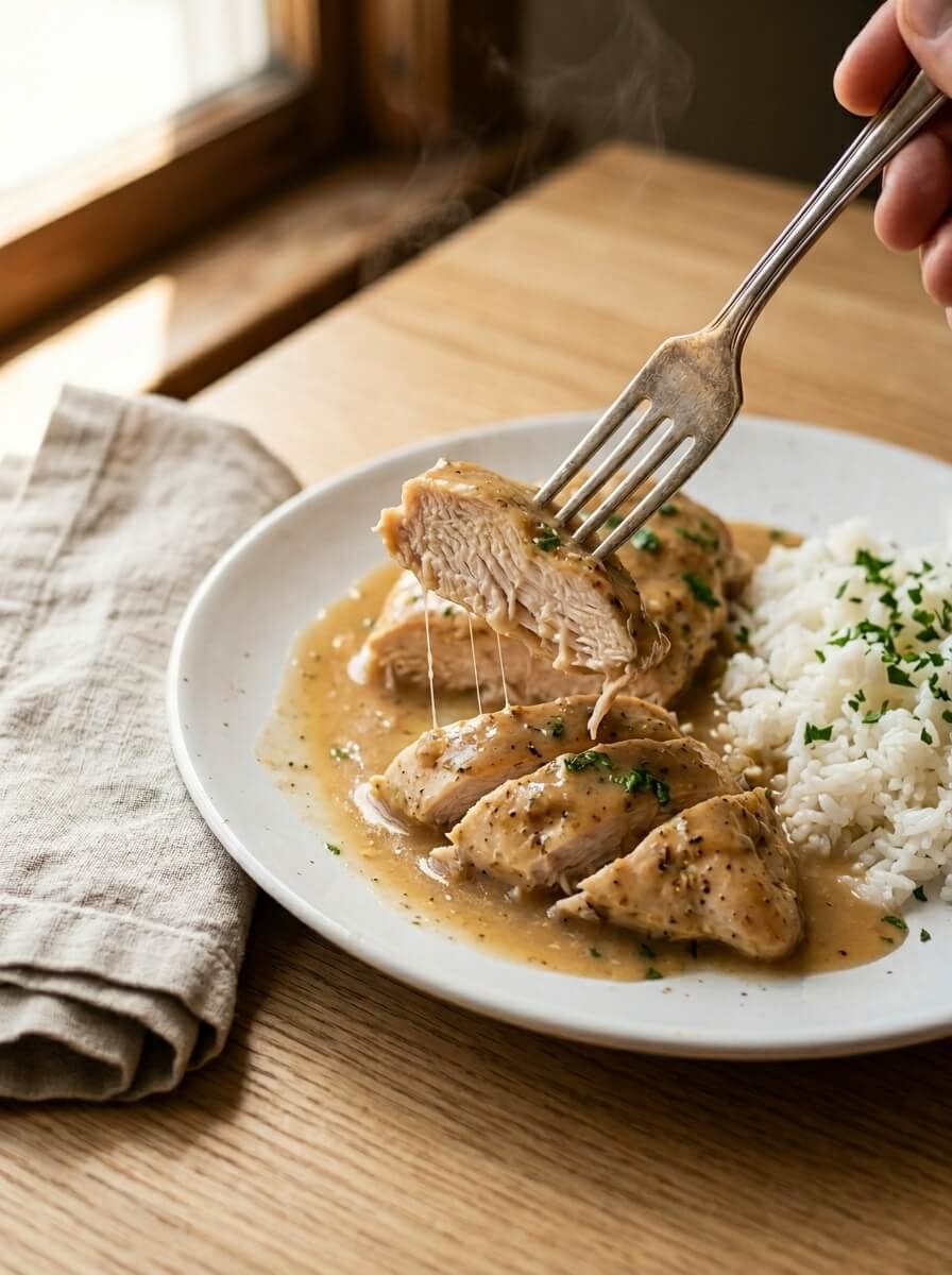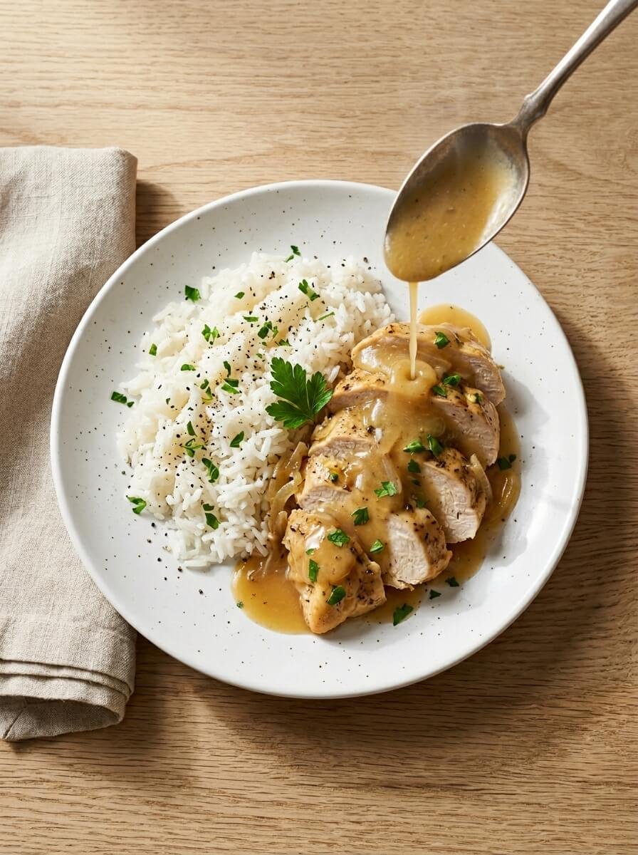 The chicken turns out tender and juicy, and the gravy is smooth, flavorful, and perfect for spooning over rice or mashed potatoes. It’s one of those meals that feels like a warm hug, without requiring hours in the kitchen.