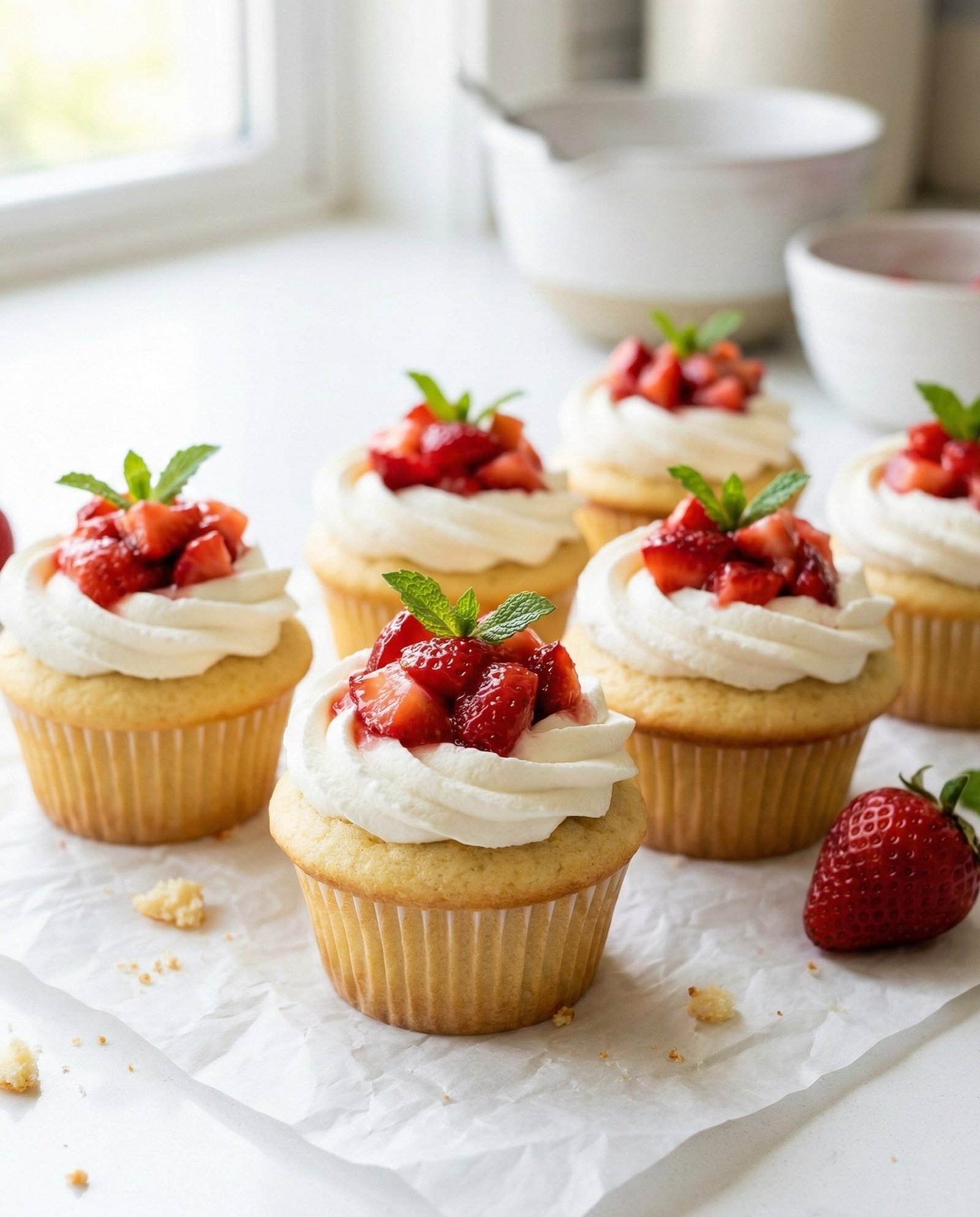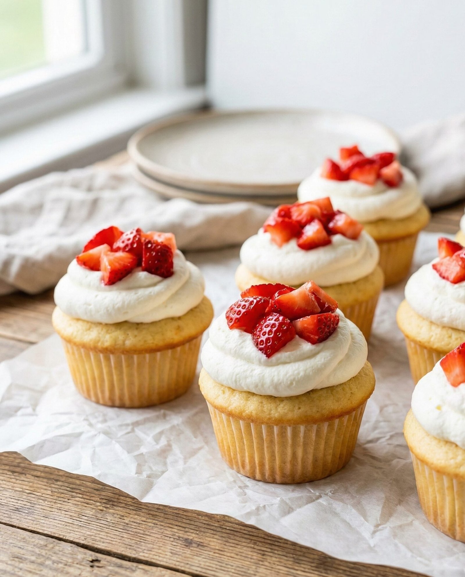 Strawberry Shortcake Cupcakes are soft, fluffy vanilla cupcakes topped with fresh strawberries and light whipped cream, bringing all the classic flavors of strawberry shortcake into a perfectly portioned dessert.