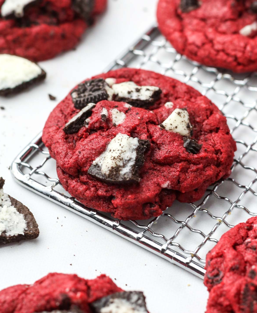 These crushed Oreo red velvet cookies have soft, chewy centers and chunks of Oreos in every bite. Their rich chocolate red velvet flavor pairs perfectly with the sweet and creamy Oreo filling.