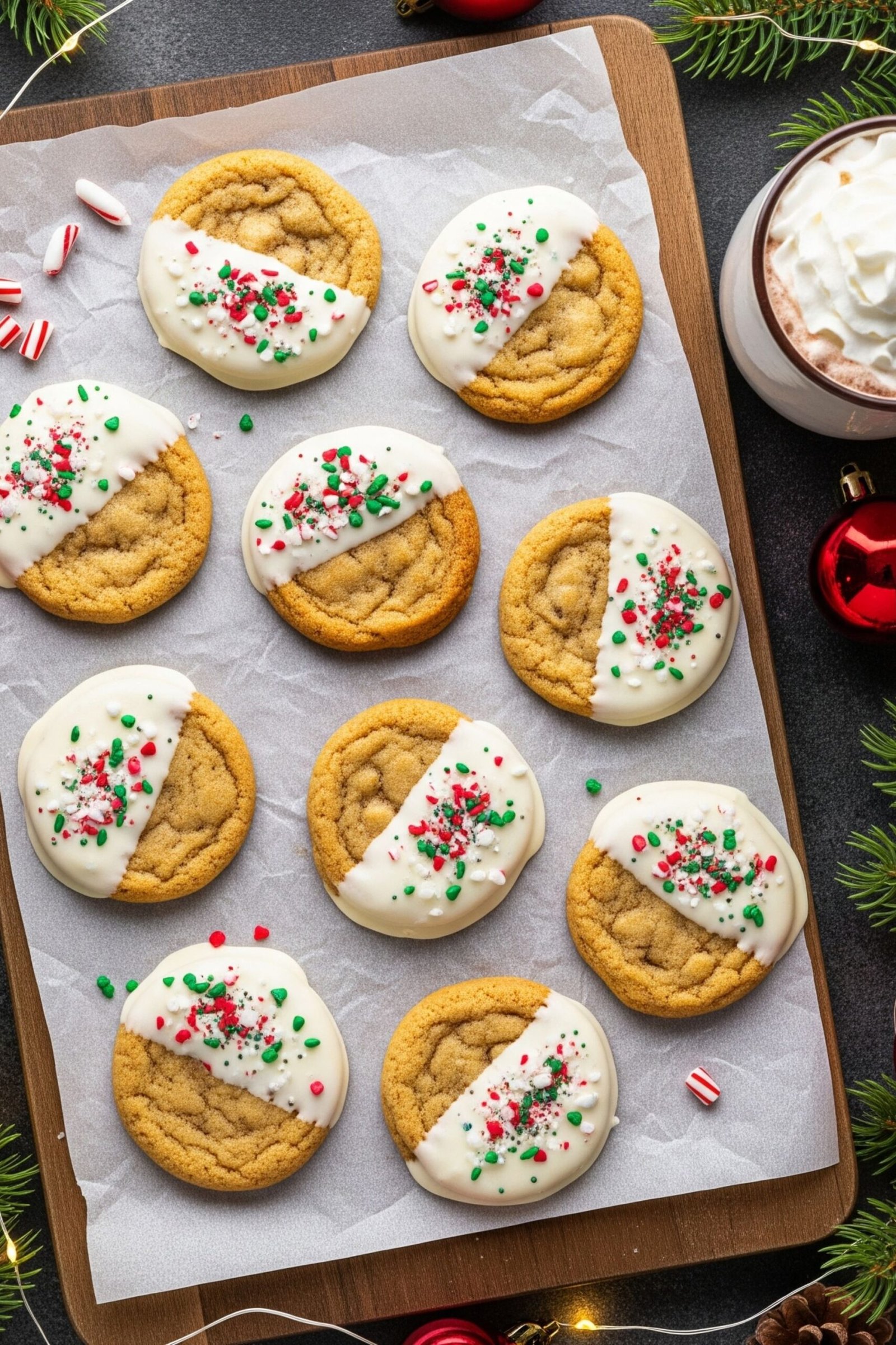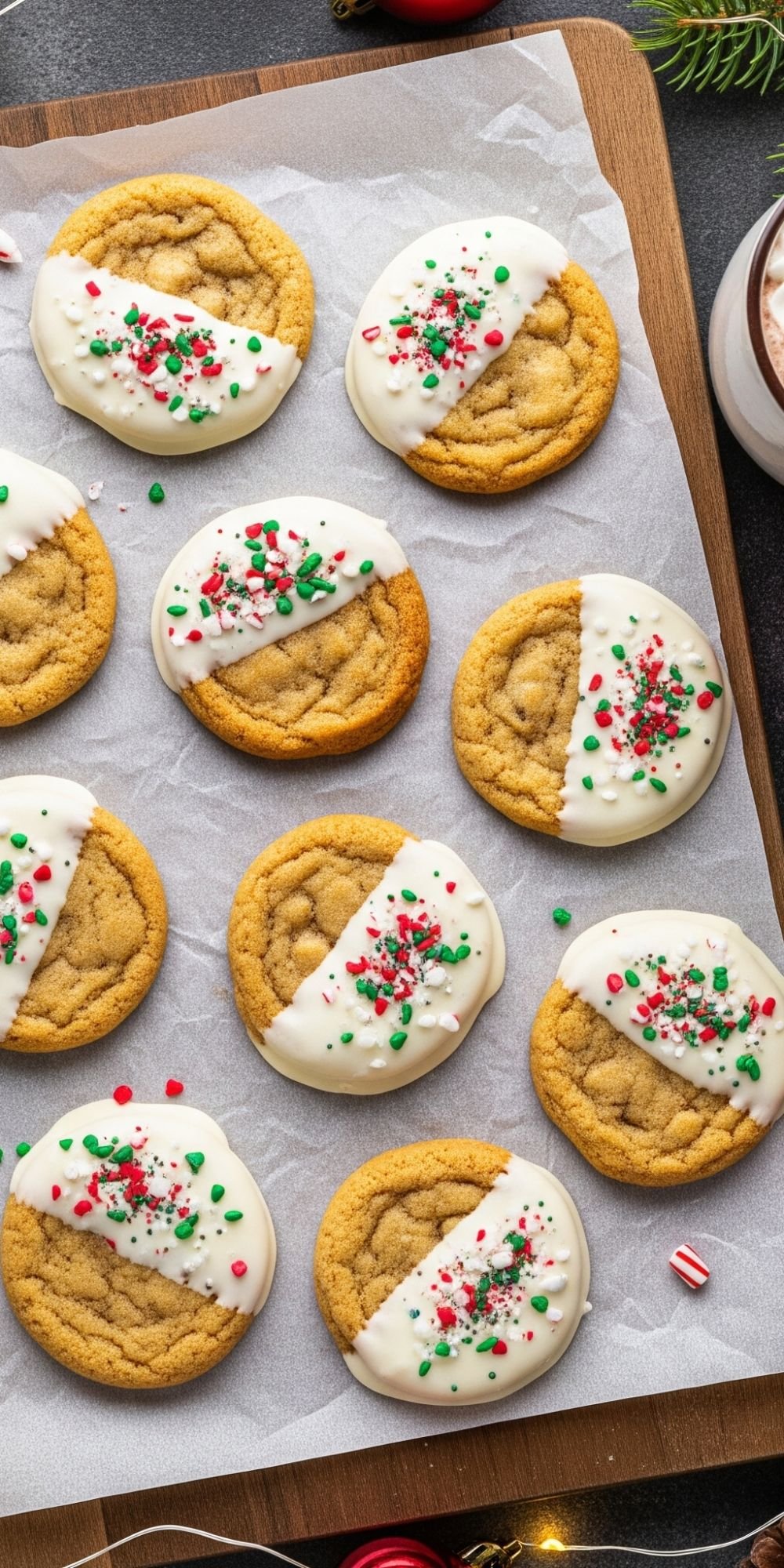 The half-dip in white chocolate makes these cookies stand out on any holiday tray, and a sprinkle of crushed peppermint or sprinkles gives them a seasonal flair.